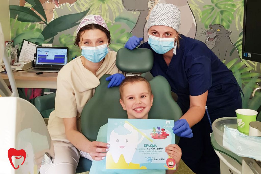 La CardioDent, răsplătim curajul celor mici cu diplome colorate și fel și fel de surprize. De asemenea, mediul în care îi întâmpinăm pe micuții noștri pacienți este unul prietenos, colorat, de poveste, tocmai pentru ca piticii să intre cu plăcere și curiozitate la noi în clinică.
